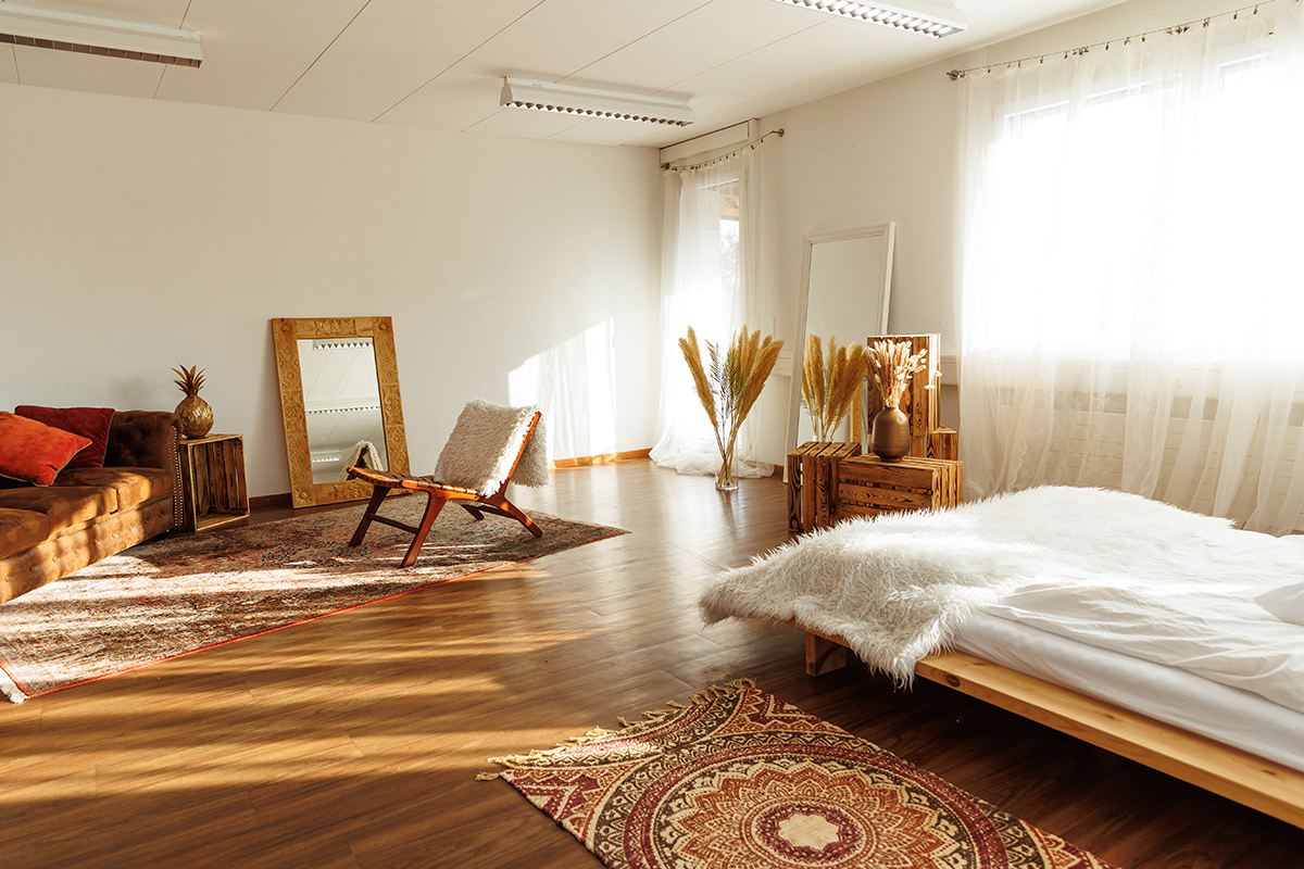 Mein Studio befindet sich in Sins, direkt an der Reuss, und bietet viel natürliches Licht sowie einen wunderschönen Blick ins Grüne. Auf 100 m² erwarten dich ein moderner Stylingbereich, eine gemütliche Kaffee-Ecke und ein liebevoll gestalteter Boudoir-Bereich im hellen Boho-Stil – perfekt zum Ankommen und Wohlfühlen.